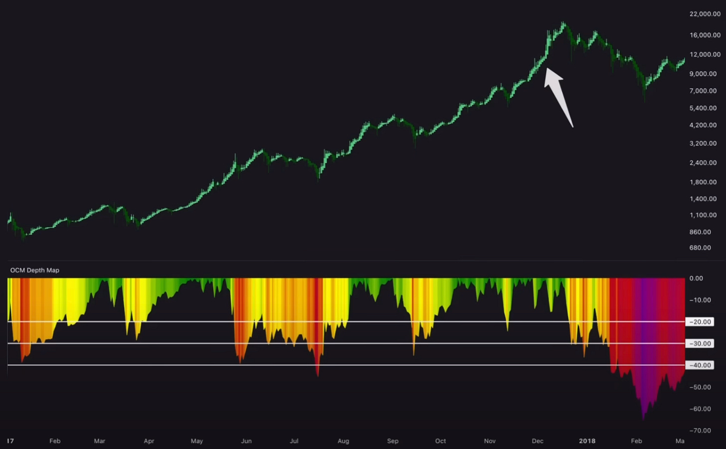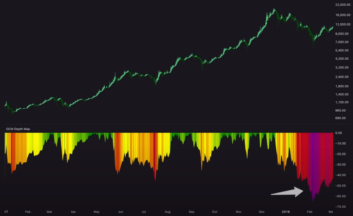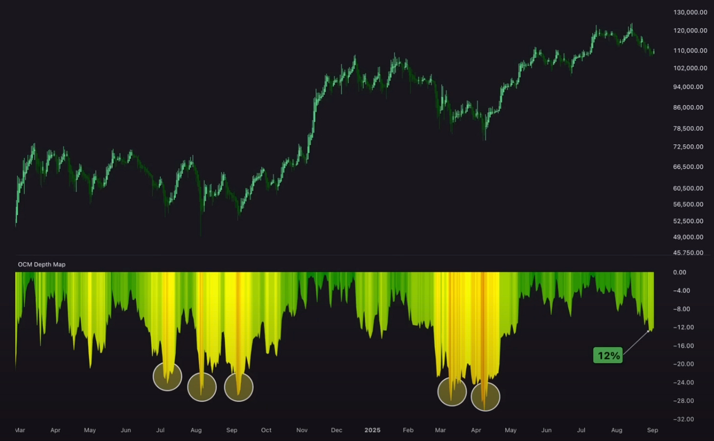 Para poner todo esto en perspectiva, si observamos el mapa de profundidad, que mide la caída actual desde el precio máximo histórico anterior, podemos ver que esta última corrección desde dicho máximo es de aproximadamente un 12%.