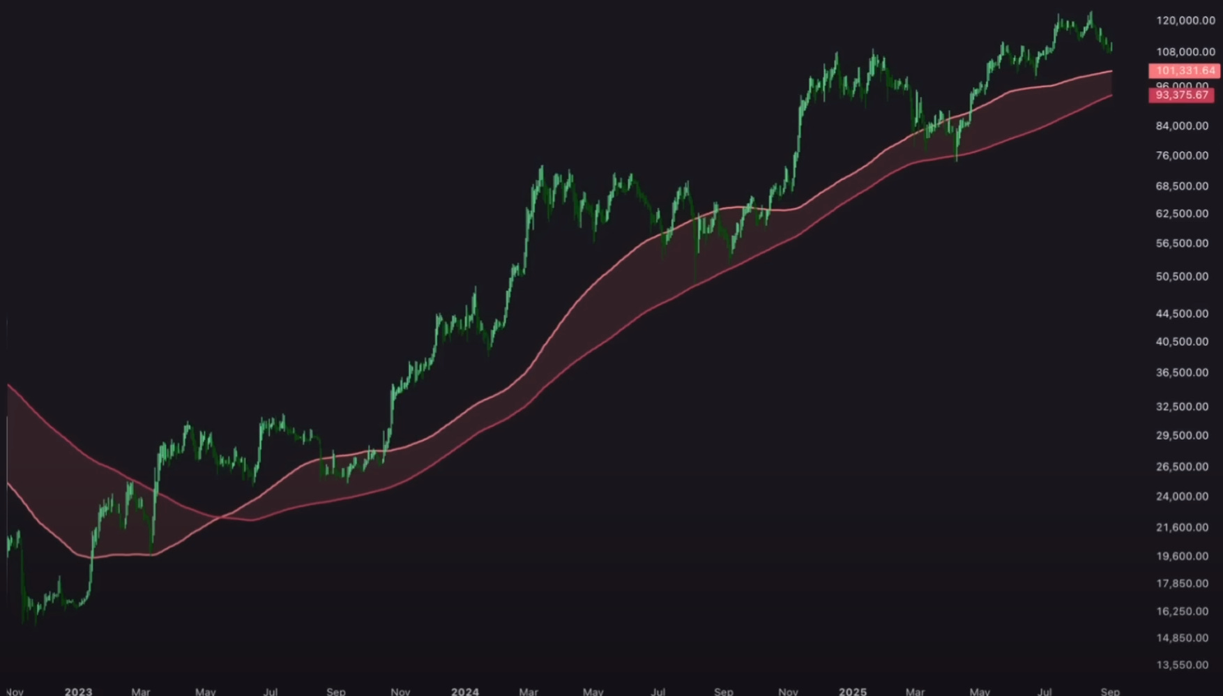 Bueno, si observamos la media móvil de 365 días, podemos ver que actualmente se sitúa en $93.000.