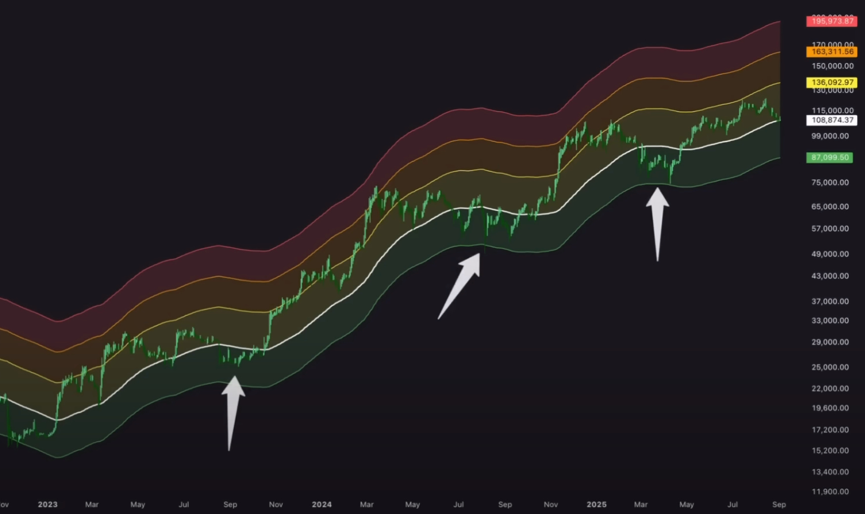 Curiosamente, el fondo de la banda se encuentra actualmente en $87,000, que es la cifra de corrección del 30% anterior que comentábamos.