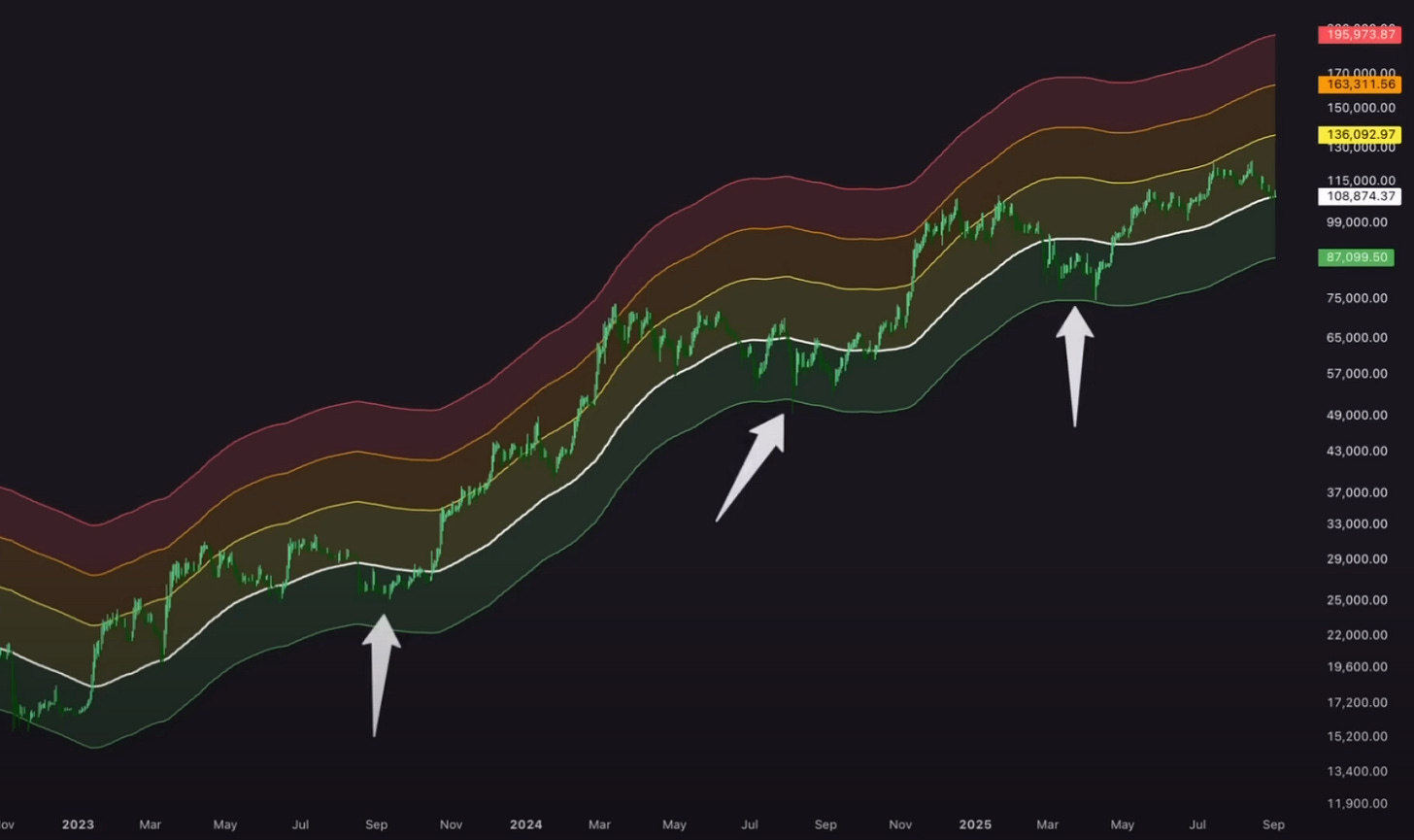 Cada vez que hemos entrado en la banda de precio verde durante este ciclo, se nos ha presentado una increíble oportunidad de riesgo-recompensa para acumular más Bitcoin a bajo precio a escala local.