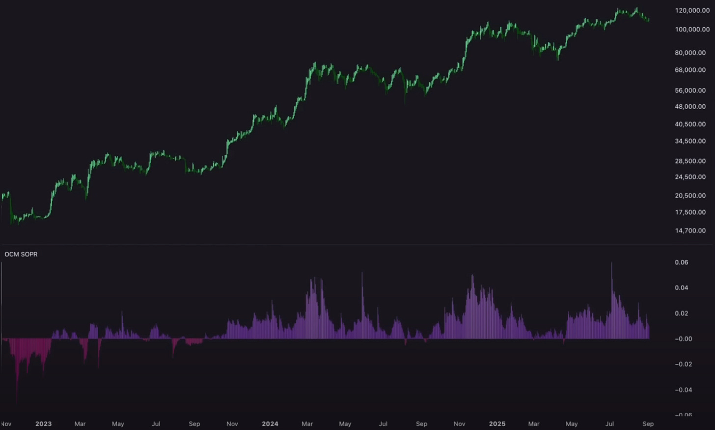 A nivel sólo on-chain necesitaríamos ver esta métrica en negativo que indiquen una realización significativa de pérdidas en esta métrica, junto con estar cerca de una de estas medias móviles clave a largo plazo, como la media móvil anual, para cambiar mi sesgo y empezar a esperar una caída prolongada.