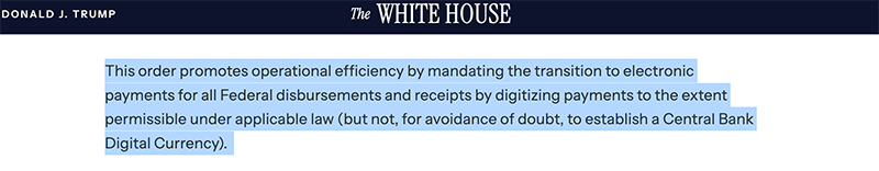 La mejor distracción para hacerlo ha sido poner a Trump en la presidencia y que firmara una orden muy bonita por un lado, en la que se especificaba que no iban a lanzar CBDC específicamente...(1).